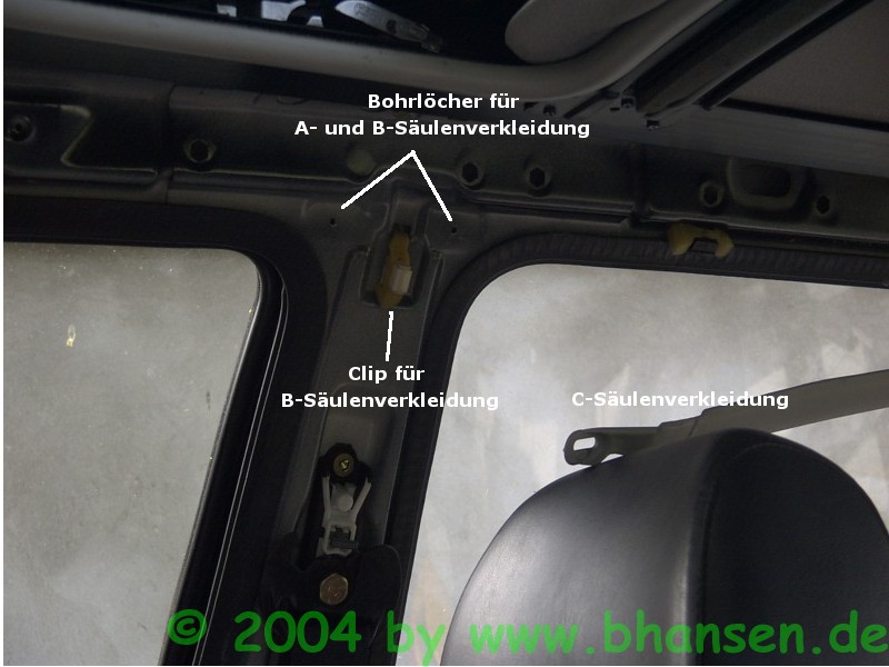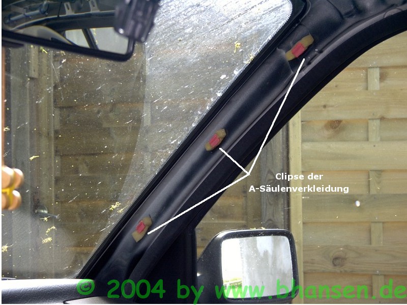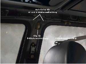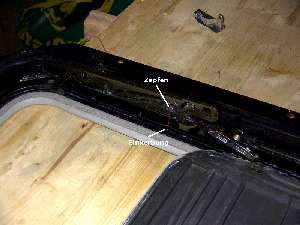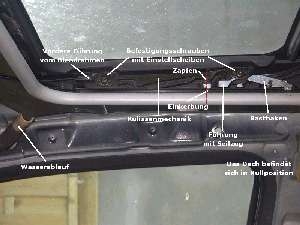 Wasserabläufe reinigenWenn der Dachhimmel schon demontiert ist, sollte man die Gelegenheit nutzen, um die Abläufe zu reinigen. Die vorderen Abläufe Ende zwischen den beiden Gelenken der Vordertüren, die hinteren Abläufe enden hinter der hinteren Stoßstange.Mit einer Sprühflasche Wasser in die Abläufe spritzen, bis Wasser aus den Öffnungen heraustritt. Das Wasser sollte herauslaufen. Wenn es nur tropft, mit einer alten Tachowelle oder dünnem Stahlseil die Abläufe durchbohren. Auf keinen Fall Druckluft benutzen, weil sonst die Ablaufschläuche von den Endstücke abrutschen. |